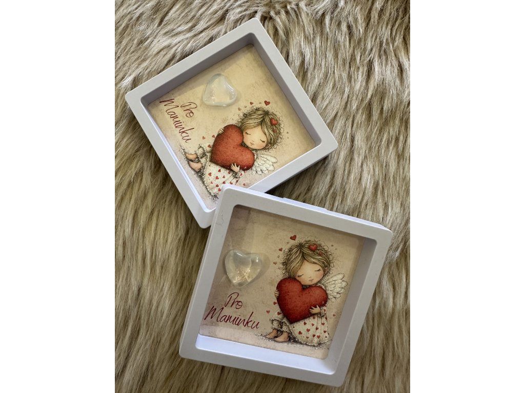 Hledáš jedinečný dárek pro maminku? Máme pro tebe elegantní plastovou bílo-šedou otevírací krabičku s minerálním srdíčkem a vloženou kartou andělky.