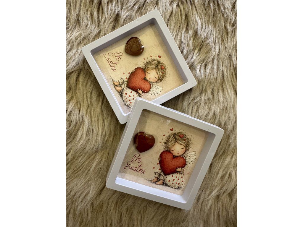 Hledáš jedinečný dárek pro sestru?  Máme pro tebe elegantní plastovou bílo-šedou otevírací krabičku s minerálním srdíčkem a vloženou kartou andělky.