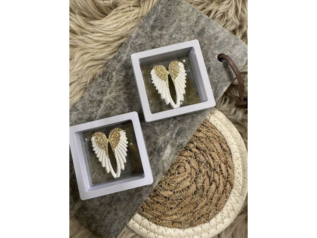 Brož křídel s bílým smaltem je ozdobená broušenými kamínky s jemným leskem, můžete ji využít na běžné nošení i na společenské události - návštěvy divadel, oslavy apod. Z rubu má brožový špendlík. Můžete ji nosit nejen na oděvech, hodí se i k ozdobení klobouků, tašky či sepnutí šátku.