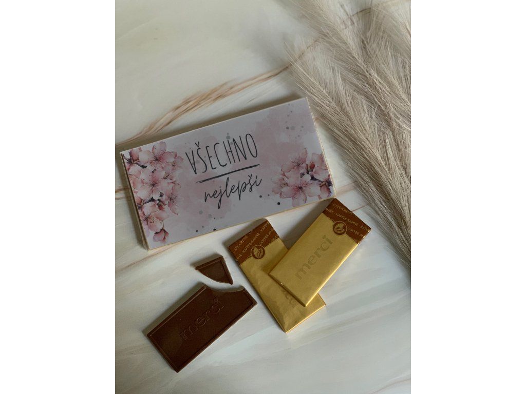 je elegantní a oblíbený dárek, kterým vyjádříte poděkování, lásku i milou pozornost. Kvalitní čokoláda potěší každého milovníka sladkého. Je  doplněná dárkovou kartičkou a zablená v celofánu, díky čemuž je připravena rovnou k darování bez dalšího balení.