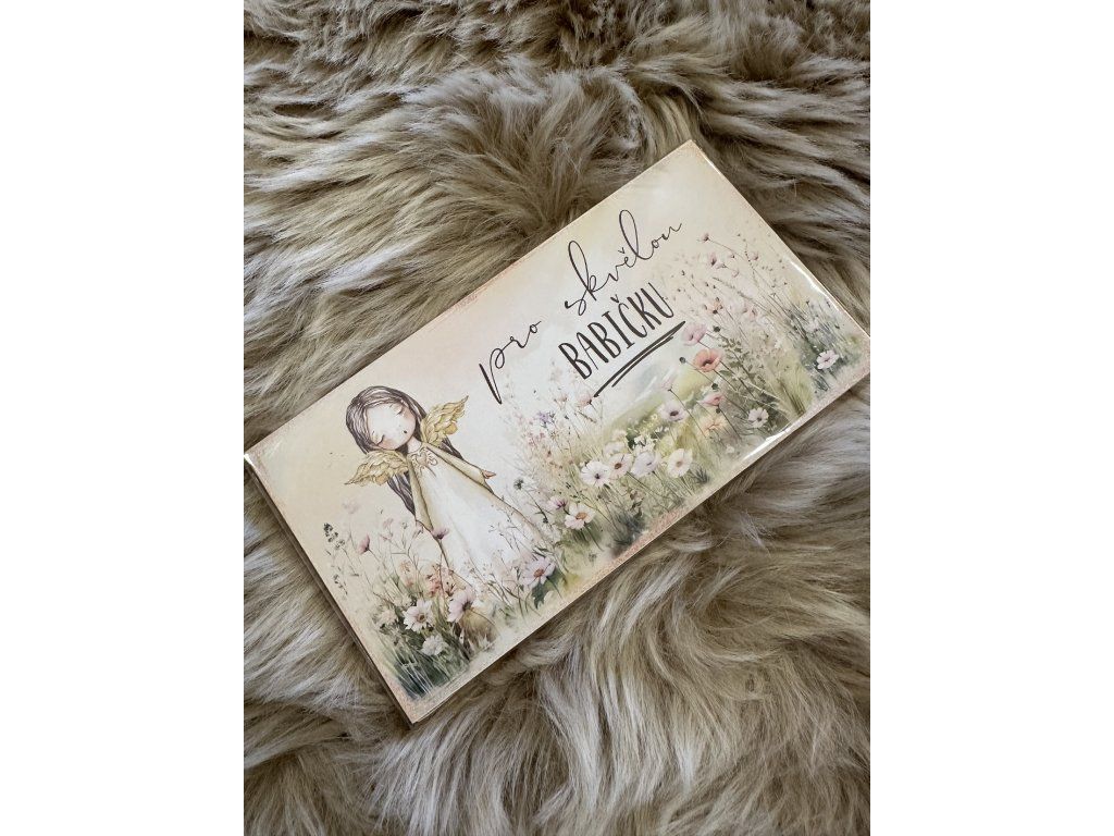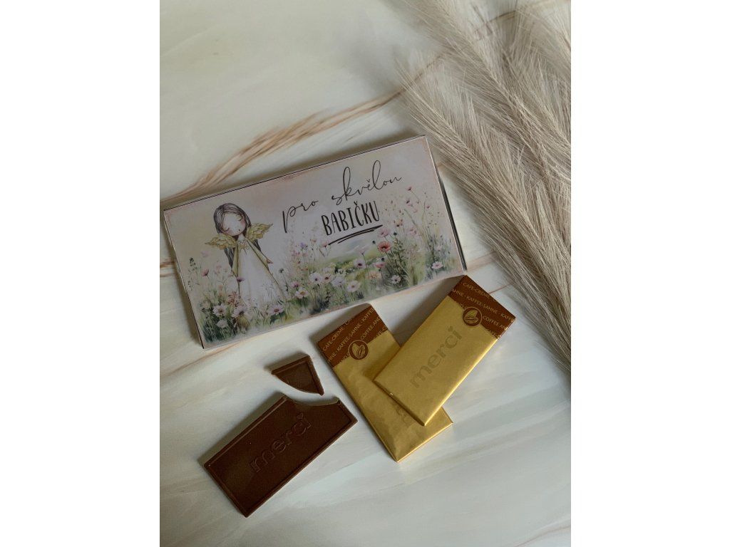 je elegantní a oblíbený dárek, kterým vyjádříte poděkování, lásku i milou pozornost. Kvalitní čokoláda potěší každého milovníka sladkého. Je doplněná dárkovou kartičkou a zablená v celofánu, díky čemuž je připravena rovnou k darování bez dalšího balení.
