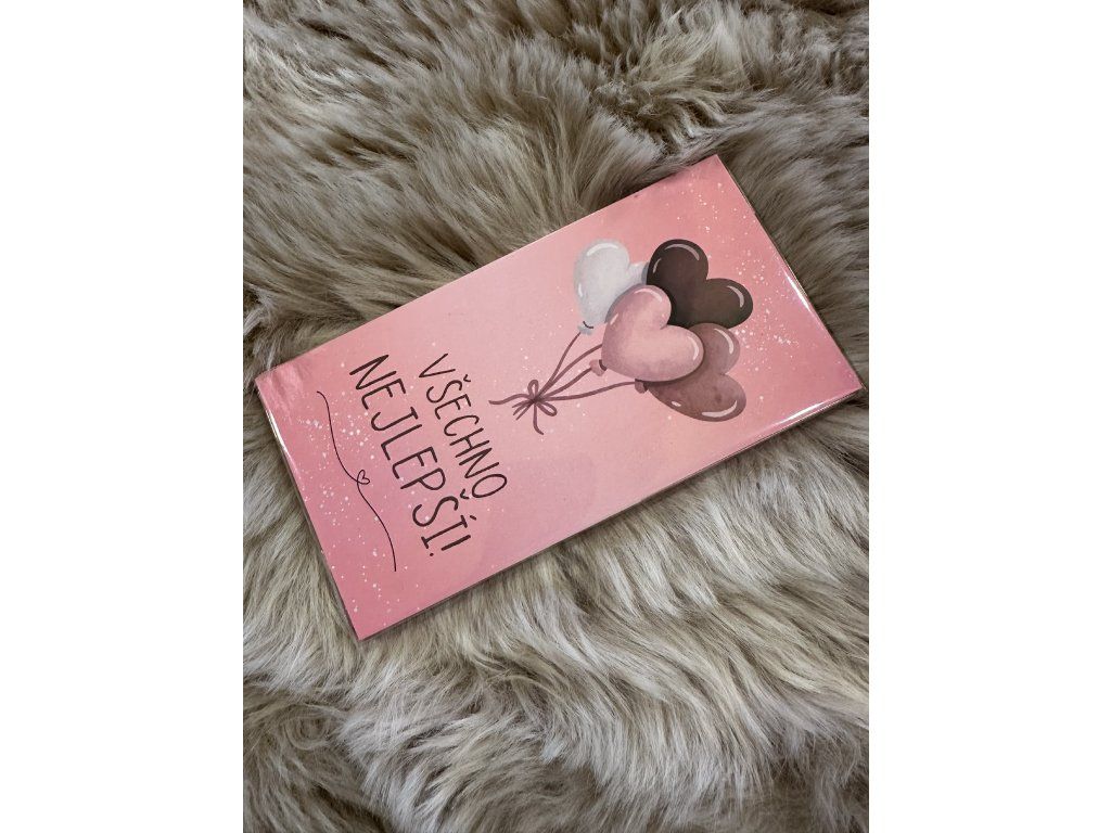 je elegantní a oblíbený dárek, kterým vyjádříte poděkování, lásku i milou pozornost. Kvalitní čokoláda potěší každého milovníka sladkého. Je  doplněná dárkovou kartičkou a zablená v celofánu, díky čemuž je připravena rovnou k darování bez dalšího balení.