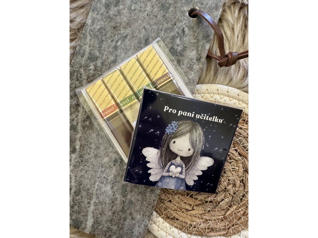 Výběr čtyř lahodných příchutí čokoládových tyčinek Merci doplněný o dárkovou vloženou kartičku.