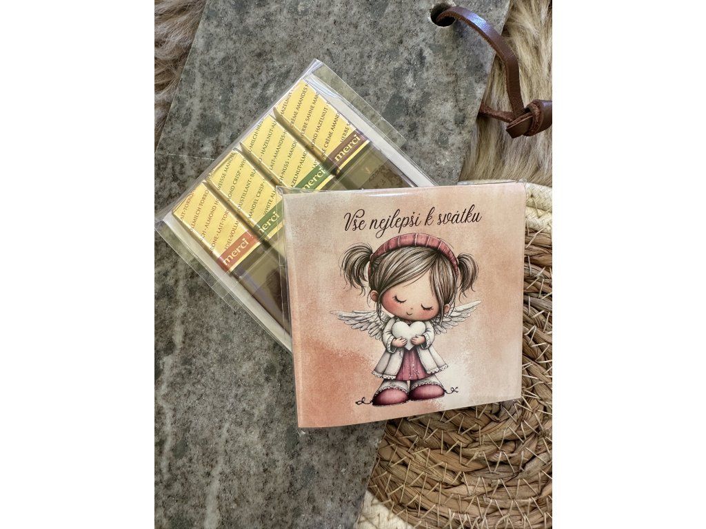 Výběr čtyř lahodných příchutí čokoládových tyčinek Merci doplněný o dárkovou vloženou kartičku.