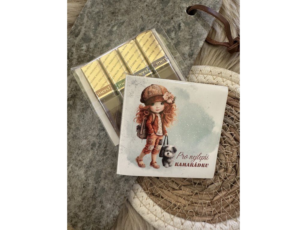 Výběr čtyř lahodných příchutí čokoládových tyčinek Merci doplněný o dárkovou vloženou kartičku.