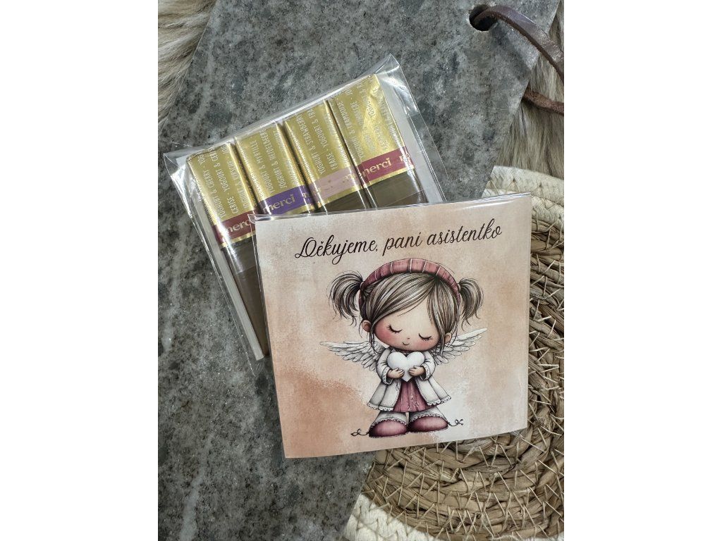 Výběr čtyř lahodných příchutí čokoládových tyčinek Merci doplněný o dárkovou vloženou kartičku.