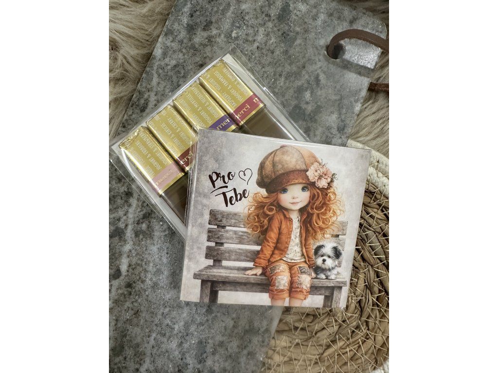 Výběr čtyř lahodných příchutí čokoládových tyčinek Merci doplněný o dárkovou vloženou kartičku.