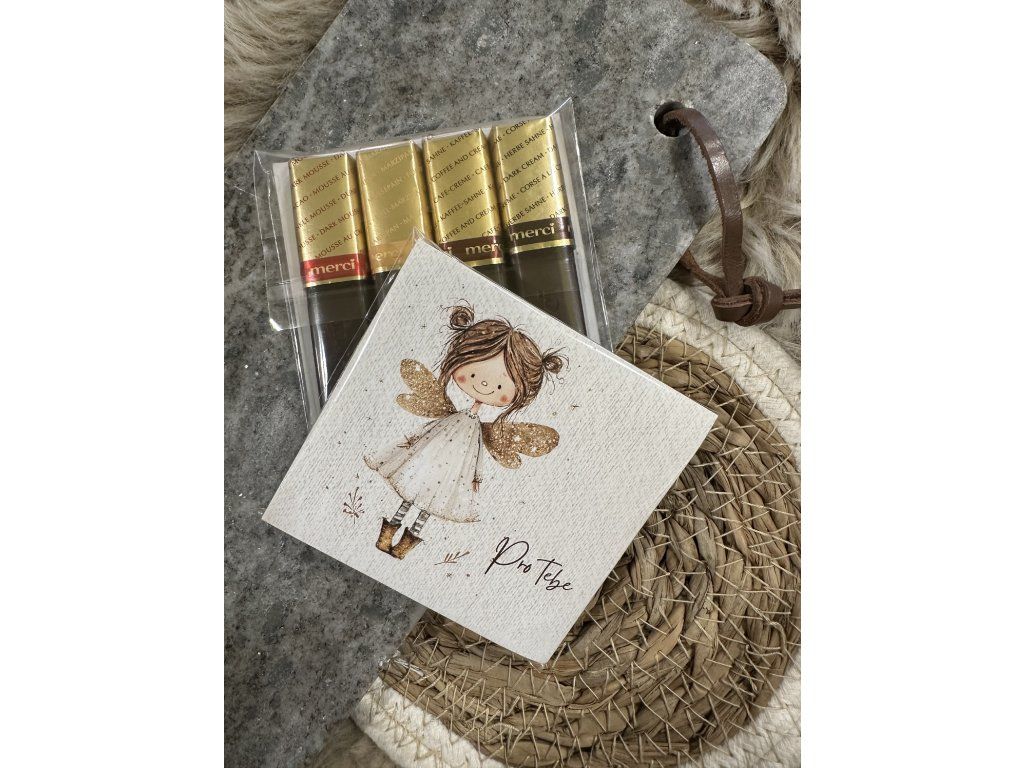 Výběr čtyř lahodných příchutí čokoládových tyčinek Merci doplněný o dárkovou vloženou kartičku.