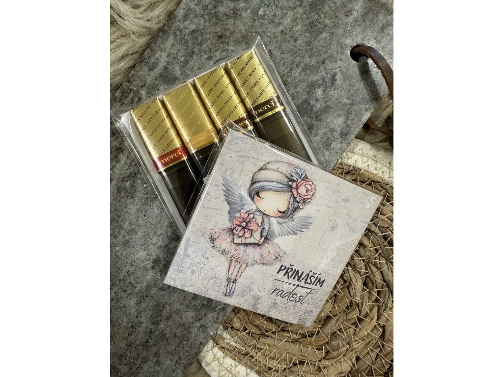 Výběr čtyř lahodných příchutí čokoládových tyčinek Merci doplněný o dárkovou vloženou kartičku.