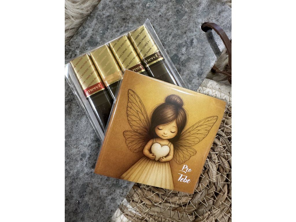 Výběr čtyř lahodných příchutí čokoládových tyčinek Merci doplněný o dárkovou vloženou kartičku.