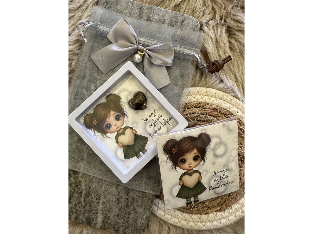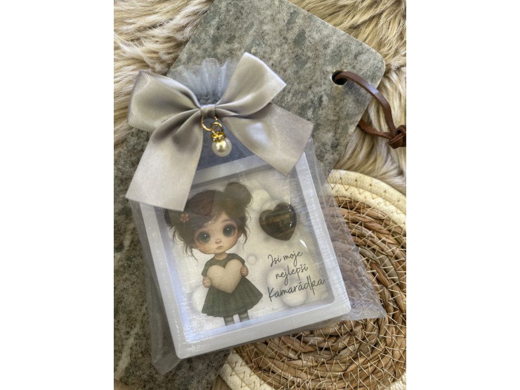 Obrázek andělky s minerálním srdíčkem  v plastové otevírací krabičce