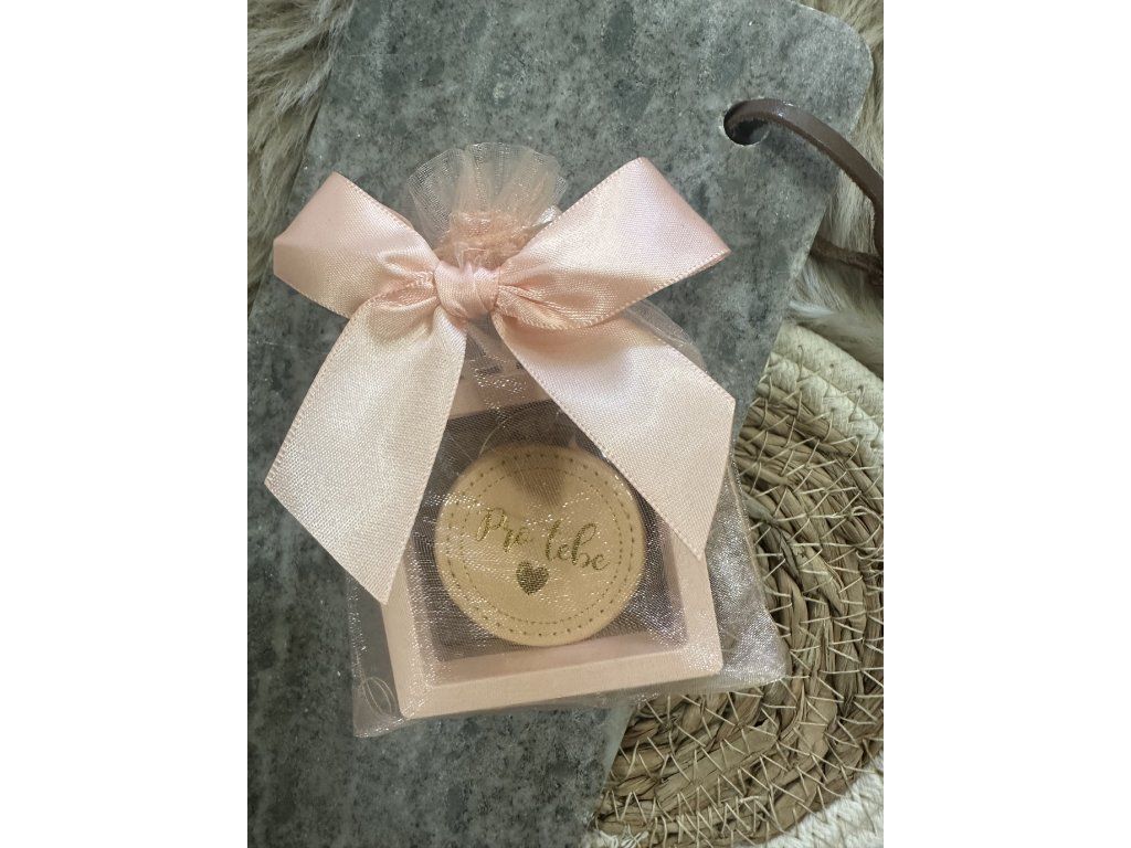 Klíčenka je vložena do růžové plastové otevírací krabičky, pečlivě zabalená v jemném meruňkovém šifonovém pytlíku dozdobená mašlí. Celý dárek je krásně ozdobený a připravený rovnou k předání – bez dalšího balení.