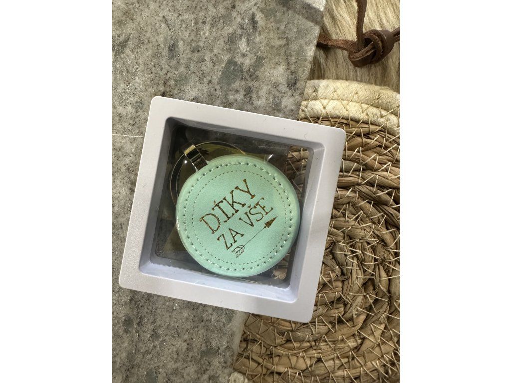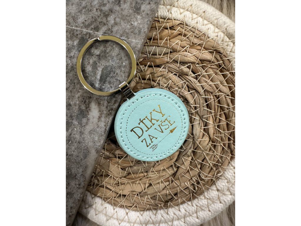 Kulatá klíčenka z koženky s nápisem DÍKY ZA VŠE