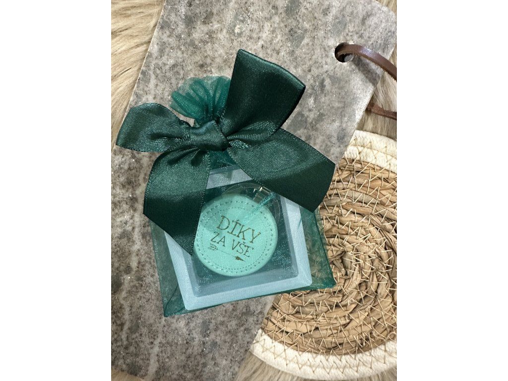 Klíčenka je vložena do bílé plastové otevírací krabičky, pečlivě zabalená v tmavě zeleném šifonovém pytlíku dozdobená mašlí.  Celý dárek je krásně ozdobený a připravený rovnou k předání – bez dalšího balení.