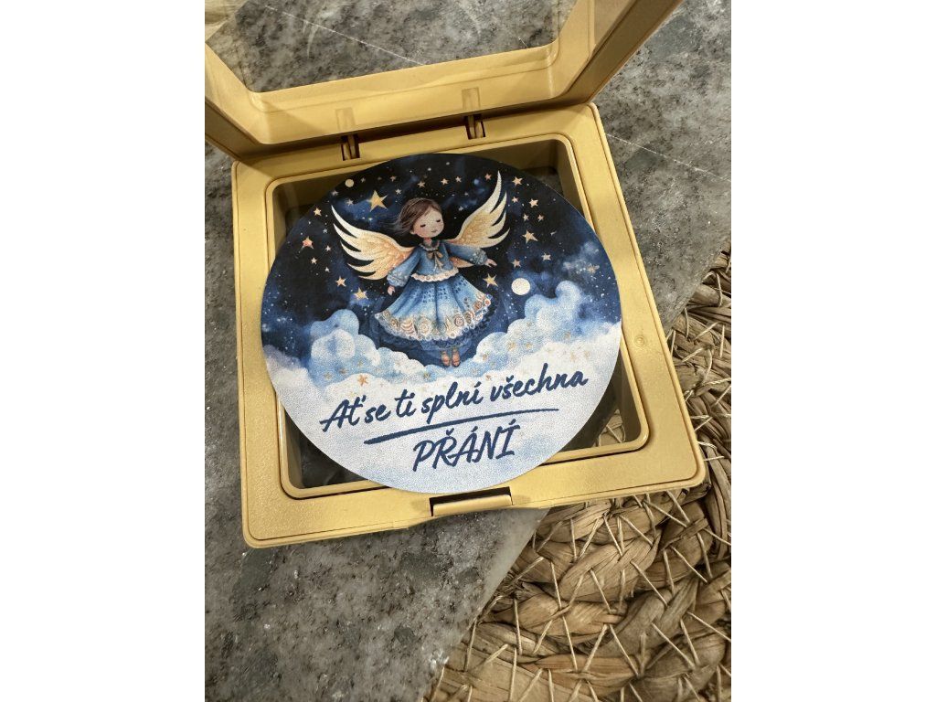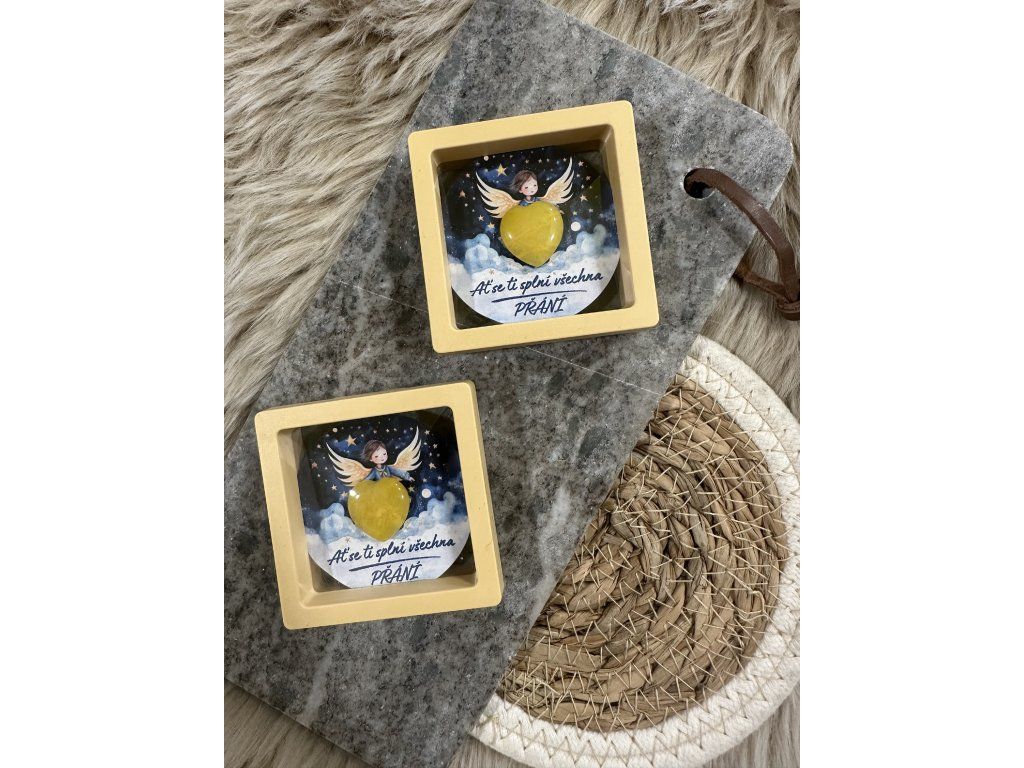 Hledáš originální dárek? Máme pro tebe elegantní plastovou okrovou otevírací krabičku s minerálním srdíčkem a samolepkou andělky.