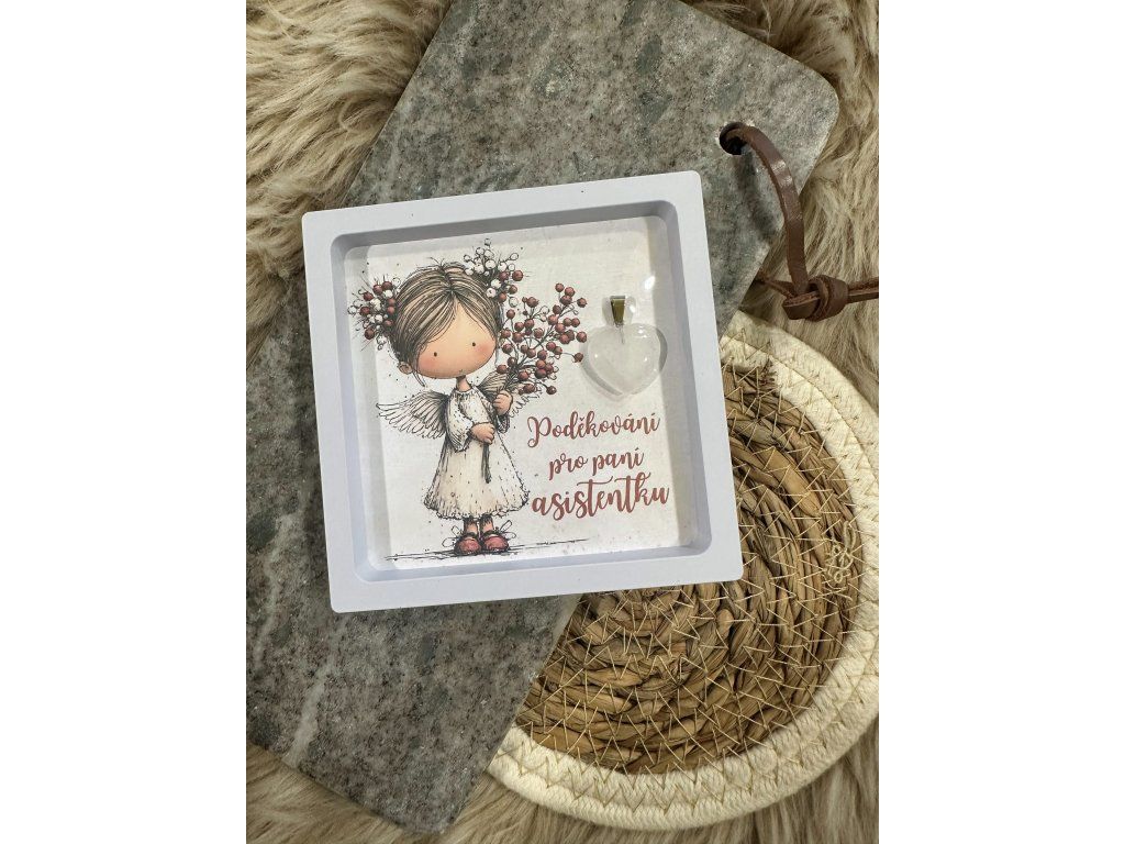 Obrázek andělky s minerálním srdíčkem pro paní asistentku